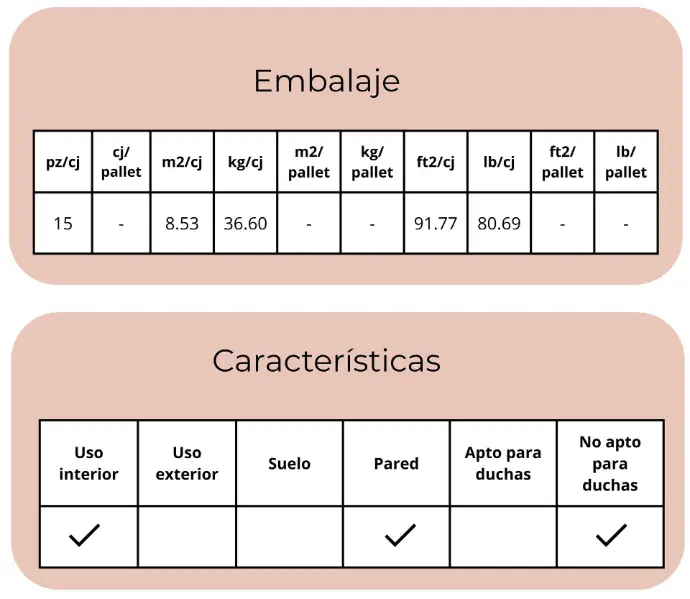 Uso interior | Uso exterior | Suelo | Pared | Apto para duchas | No apto para duchas |