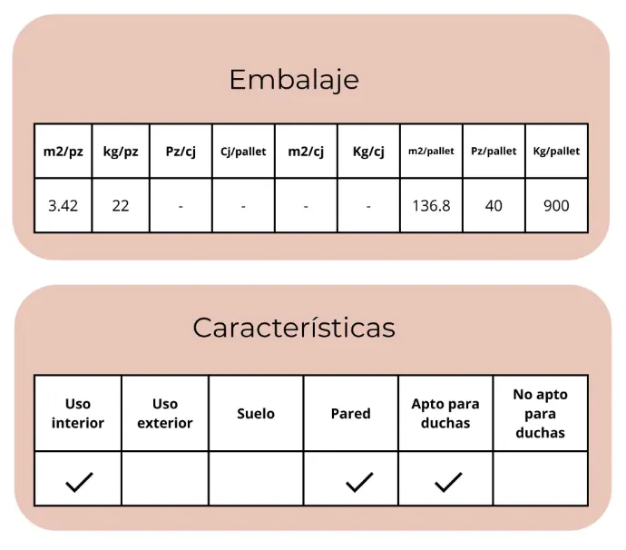 Uso interior | Uso exterior | Suelo | Pared | Apto para duchas | No apto para duchas |